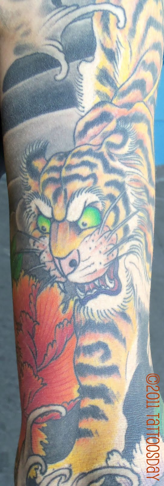 His traditional Japanese sleeve consists of a tiger, two koi, and peonies, in addition to the water background.